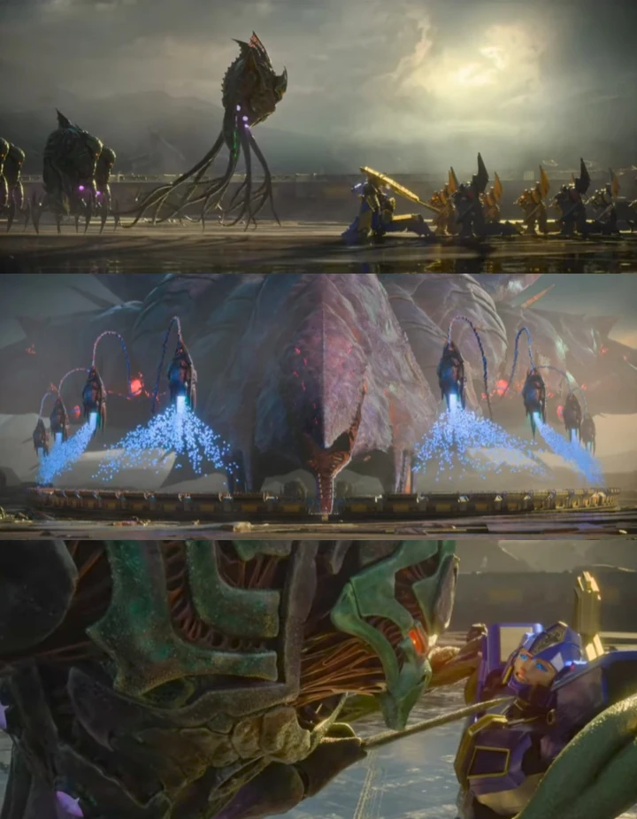 E para dissipar quaisquer dúvidas sobre a inteligência dos Quintessons? Eles literalmente sabem como operar tecnologia. Eles têm sua própria nave espacial, máquinas projetadas especificamente para extrair energon, e na cena que você pode ver acima, o Comandante espera que Sentinel se ajoelhe para que ele inicie a coleta de energon.