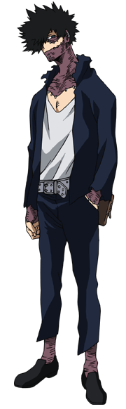 Suas roupas parecem variar de tempos em tempos. Em sua estreia inicial, ele tinha uma aparência mais áspera e folgada, usando um cinto solto, uma jaqueta rasgada e calças que mal chegavam aos tornozelos. Em aparições posteriores, ele parece usar uma jaqueta ligeiramente diferente que parece ser costurada com abotoaduras e mangas arregaçadas. Ele também usa botas agora e calças mais largas. Na batalha final com os heróis, Dabi abandona sua roupa escura original em favor de uma variante branca, provavelmente combinando com seu cabelo branco.